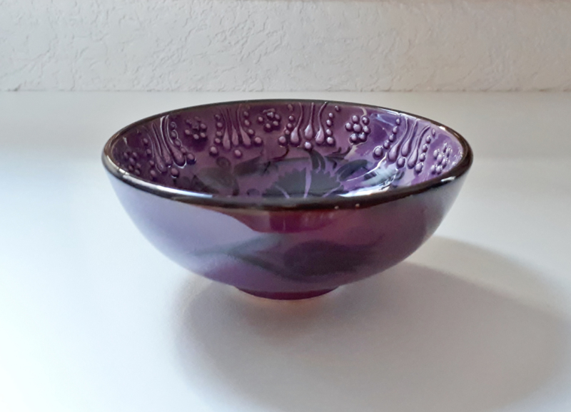 Keramieken glansrijk schaaltje, geheel met de handbeschilderd met een prachtig reliëf patroon langs de bovenrand en zwarte bloemmotieven. Deze zwarte bloemmotieven zijn per schaaltje verschillend.