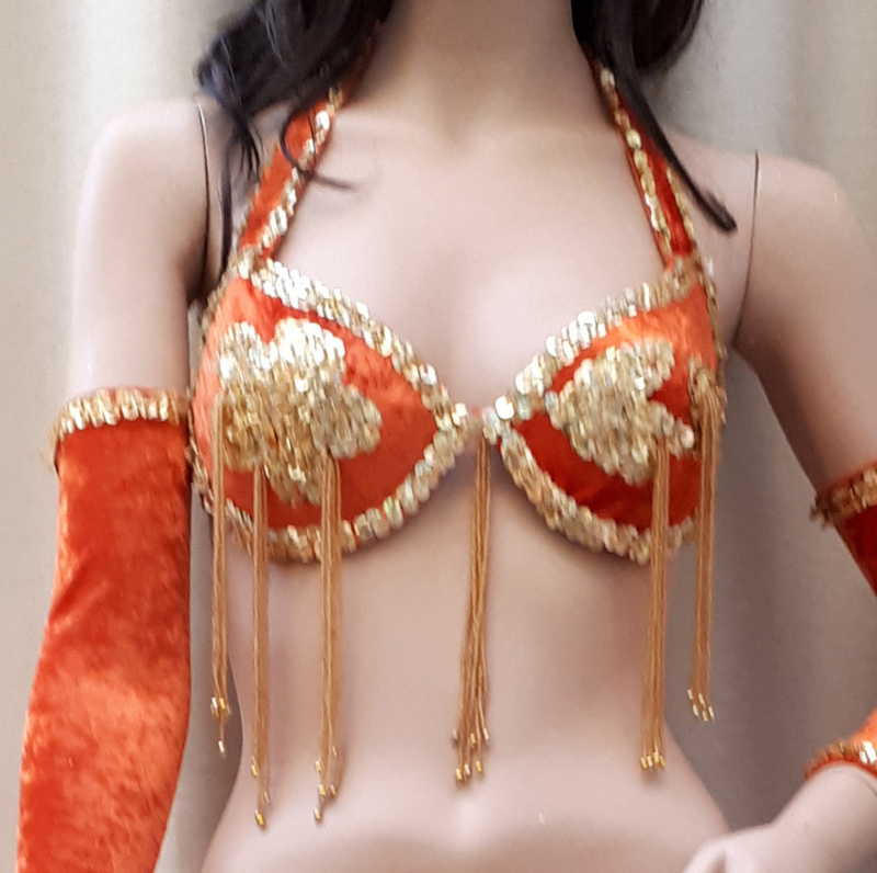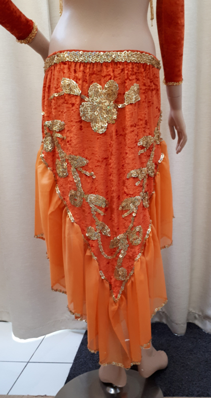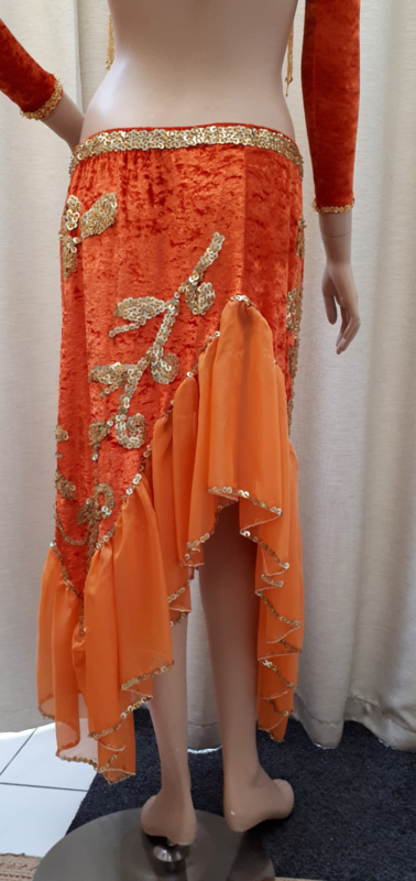 Het kostuum heeft een aparte schuin lopende wijde rok met een doorzichtige strookaanzet afgewerkt met een paillettenrand. Je kan zelf bepalen hoe je de schuine rok draagt. Je draait de rok met de schuine kant naar voren of naar de zijkant. Het kostuum is prachtig versierd met gouden pailletten en kralenfranje.