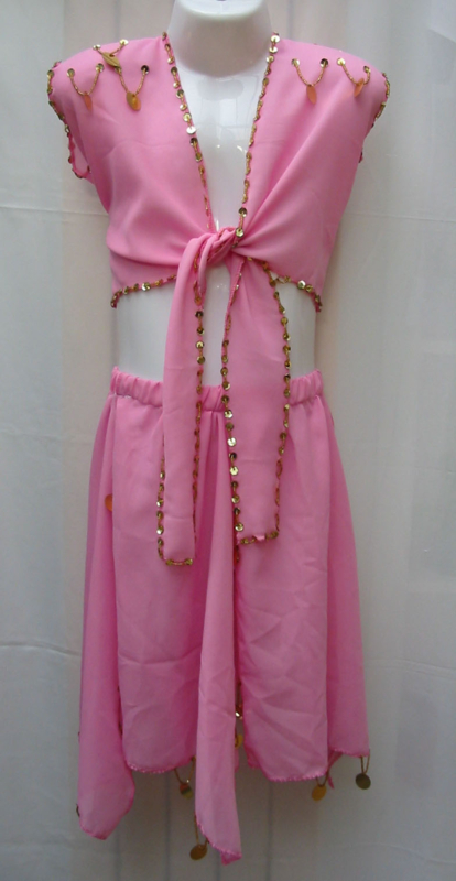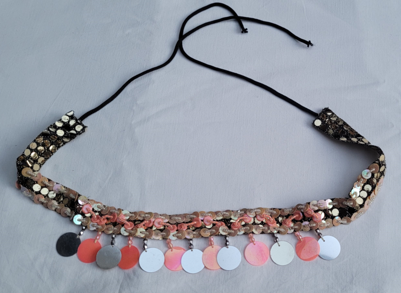 Artikelnummer: ME151-09 OverzichtBuikdanspakje bestaande uit een rokje met wikkeltopje en hoofdbandje, die versierd zijn met goudkleurige pailletjes en muntjes. Het rokje bestaat uit diverse banen stof en in de taille zit elastiek (rekt uit tot ± 68cm).
